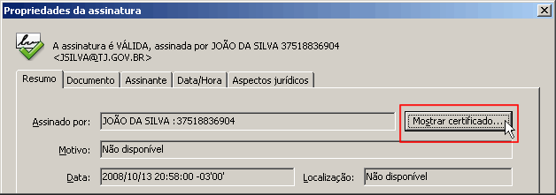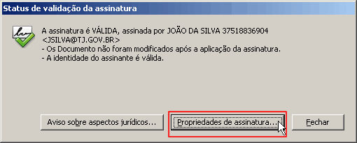 Se a assinatura é válida deve aparecer uma mensagem indicando que a certificação é válida e o documento não foi alterado desde a última assinatura. Clique em propriedade de assinatura para visualizar detalhes da assinatura.