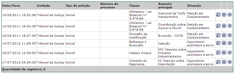 O resultado da consulta é apresentado logo abaixo dos parâmetros de consulta. Para cada petição são apresentados data e hora de envio ou salvamento, unidade, tipo de petição, número do processo (para petições intermediárias), classe, assunto principal e situação.