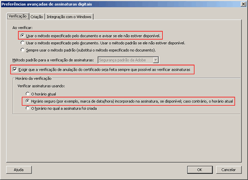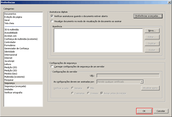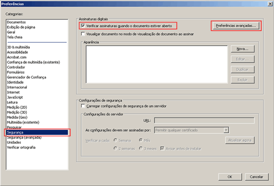 Na janela Preferências, no quadro 'Categorias', clique em Segurança. Marque a opção "Verificar assinaturas quando o documento estiver aberto" e clique no botão Preferências avançadas.