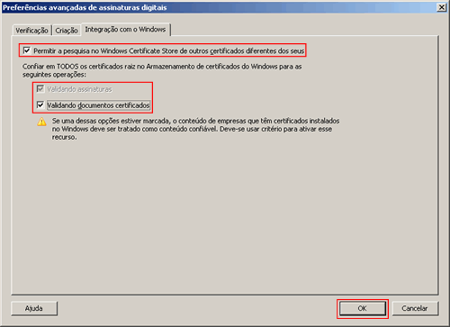 certificados", a opção "Validando assinaturas" ficará desabilitada.